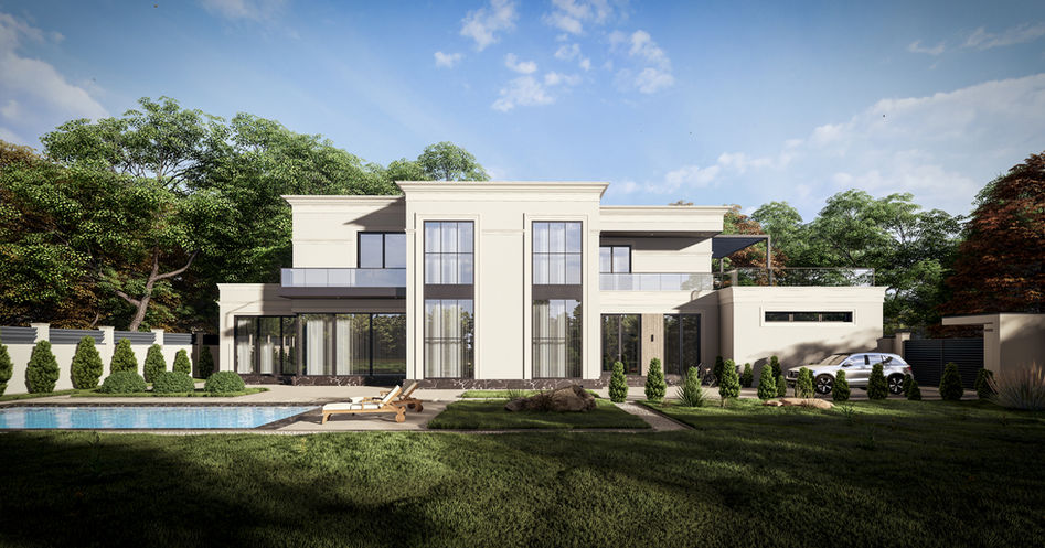 Виготовлений проект, який поєднав у собі класичний стиль та модерн, не залишить байдужим як людей , які рухаються в ногу з часом , так і осіб з консервативними поглядами. Планування даного будинку включає простору вітальню , 4 спальні ,майстер-спальню, кабінет , гараж на 3 авто , BBQ-зону та багато іншого , що забезпечує комфортне проживання.